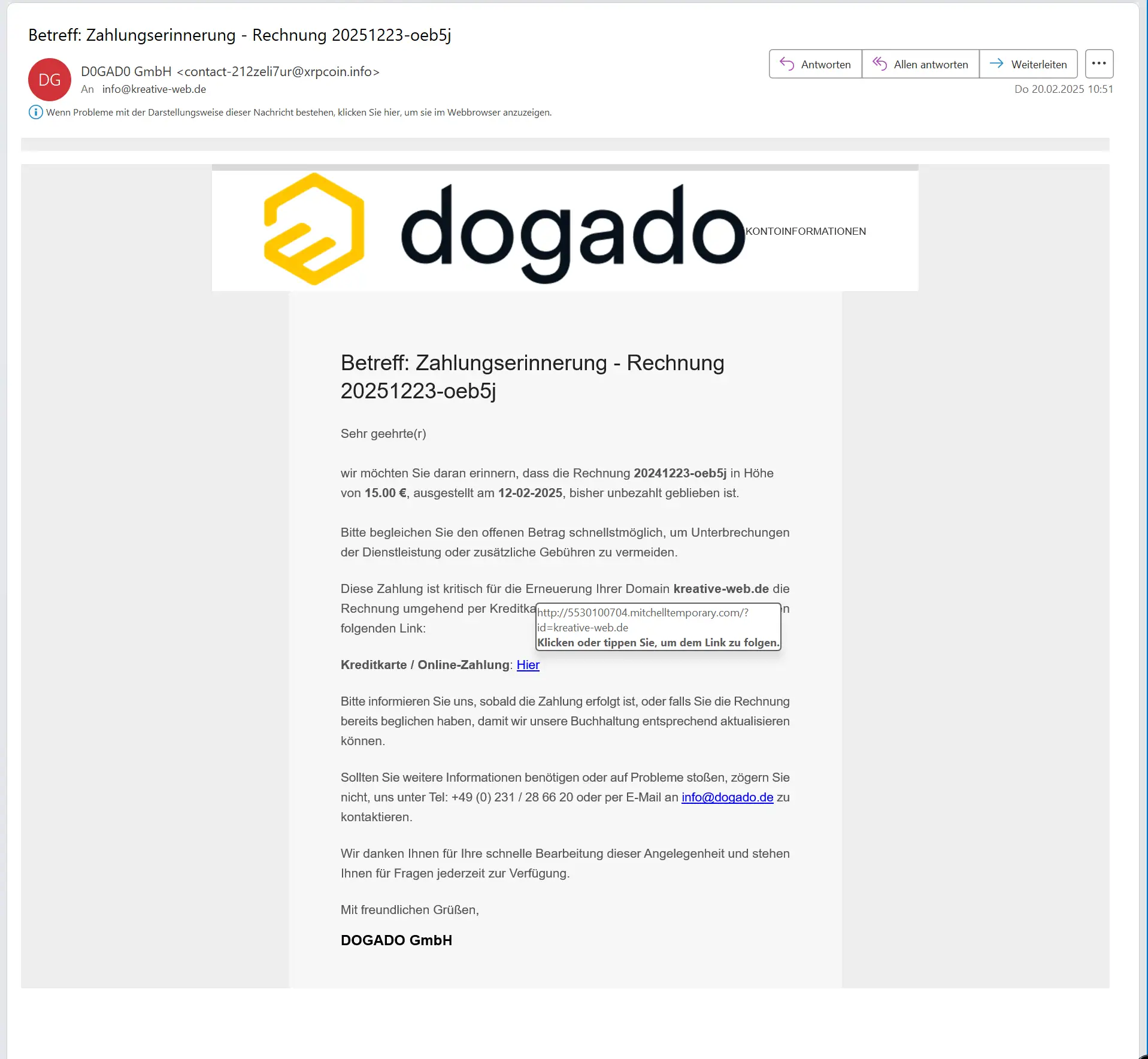 Beispielbilder einer Phishing-Mail: Die Bilder Nr. 2 und 3 zeigen, wie man den falschen Link sichtbar macht, indem man mit der Maus über das Wort „Hier“ fährt. Der nun sichtbare Link enthält kein „https“ und der Domainname passt nicht zum Anbieter, in diesem Fall Dogado.